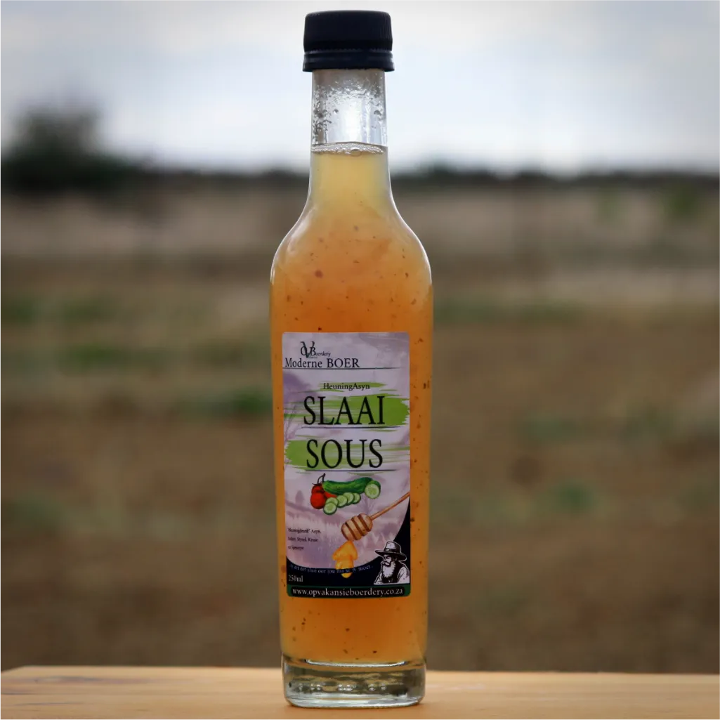 Ons ModerneBoer Heuningasyn Slaaisous bring die perfekte balans tussen soet en suur. Gemaak van natuurlik gefermenteerde heuningasyn – bekend vir sy gesondheidsvoordele – saam met ’n mengsel van geurige kruie en speserye. Hierdie slaaisous is nie net vir blaarslaai nie; dit is heerlik oor geroosterde groente, aartappelslaai, hoender of selfs as marinade vir vleis. Ons gebruik slegs kwaliteit bestanddele, sonder kunsmatige preserveermiddels of bymiddels. Elke bottel vang die plaasgeure en varsheid van die Boesmanland vas, en gee jou ’n gesonde, smaakvolle alternatief vir gewone slaaisouse. Ideaal vir gesinsetes, braaie en fynproewers wat hou van egte plaasprodukke.