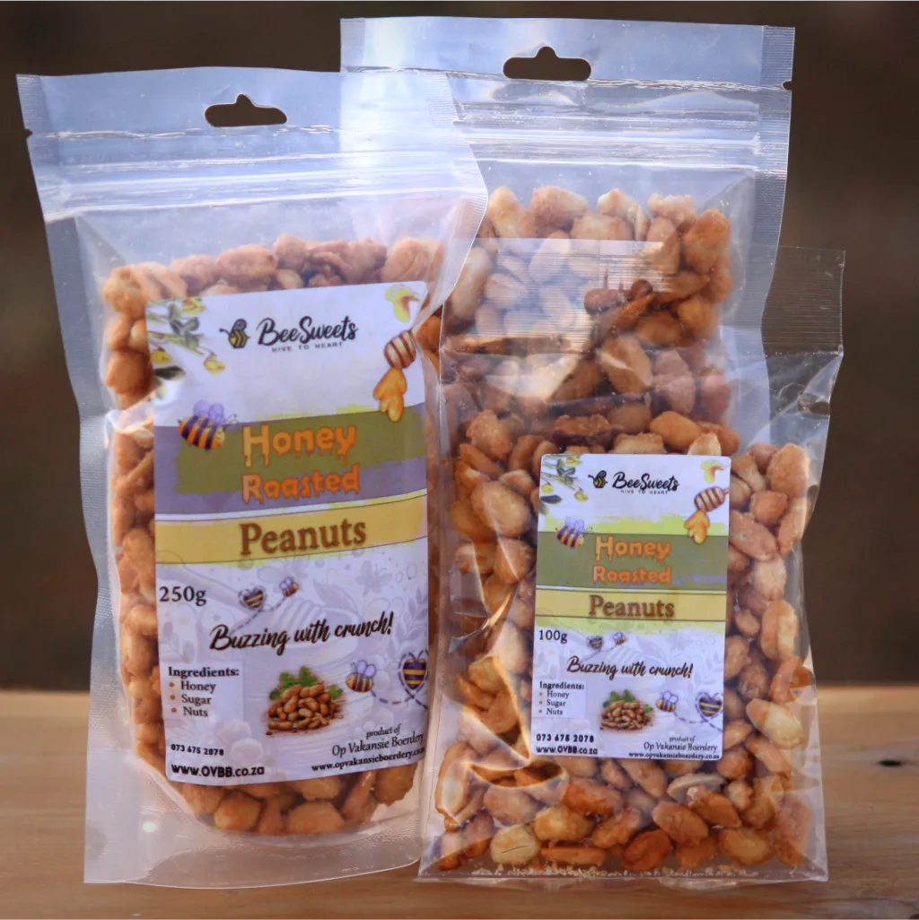 Ons Honey Roasted Peanuts is die klassieke gunsteling, maar beter! Elke grondboontjie word met sorg gerooster in egte heuning en afgerond met ’n dun suikerlaag vir ’n lekker kraak en onweerstaanbare geur. Ideaal vir ’n vinnige snack, piekniekmandjie, of net omdat jy lus is vir iets lekker.