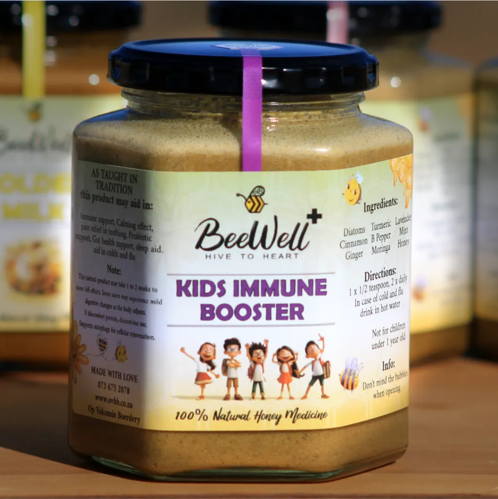 Ons Kids Immune Booster is spesiaal saamgestel vir kinders se gesondheidsbehoeftes en bevat rou heuning, diatome, kaneel, gemmer, borrie, swartpeper, moringa, laventel en kruisement. Hierdie kombinasie kan help om die immuunstelsel te versterk, verkoues te verminder en ’n kalmerende effek te bied. Laventel en kruisement kan bydra tot beter slaap, terwyl die kruie ook spysverteringsongemak kan verlig en kan help met seer tydens tandekry.